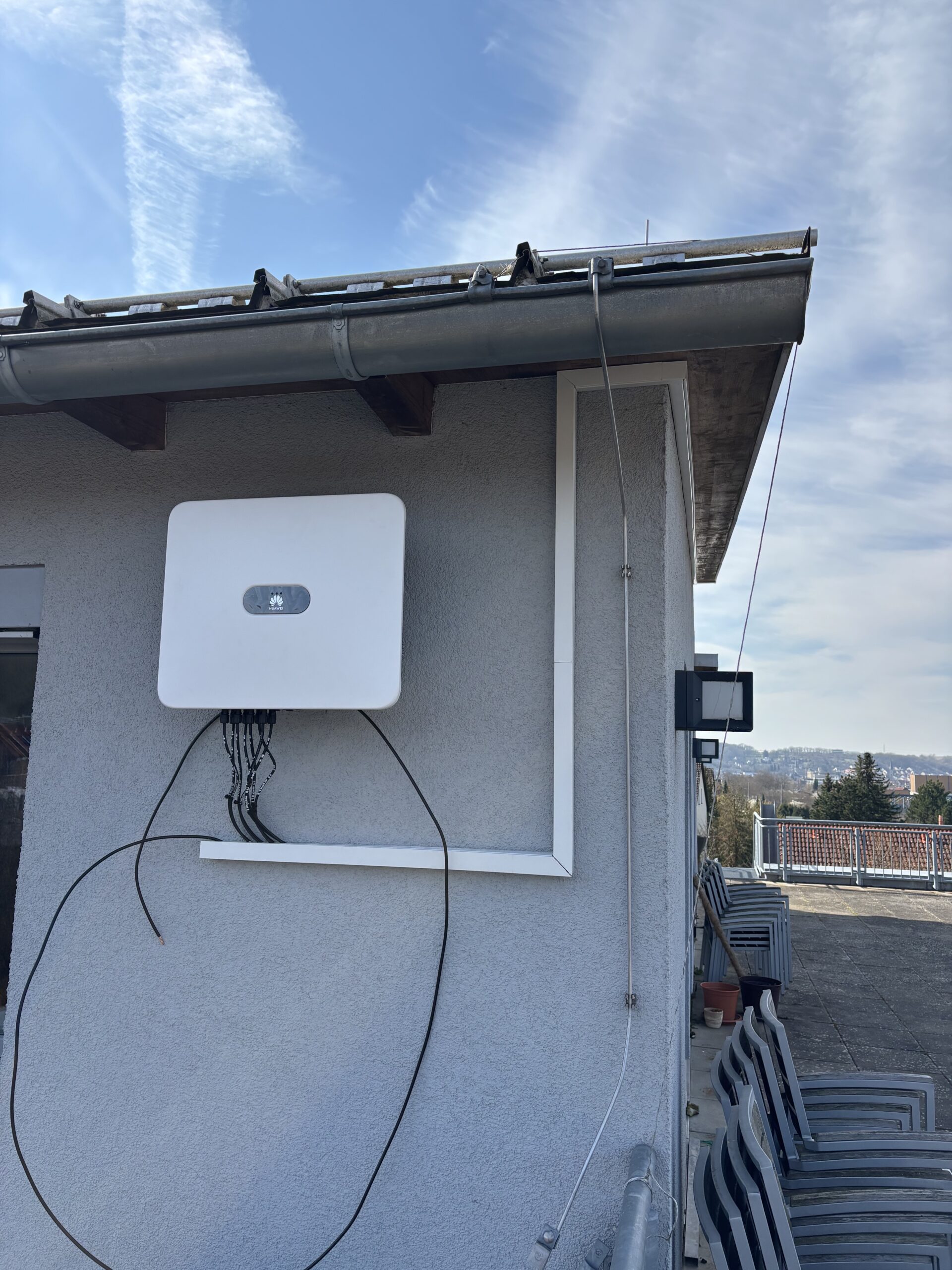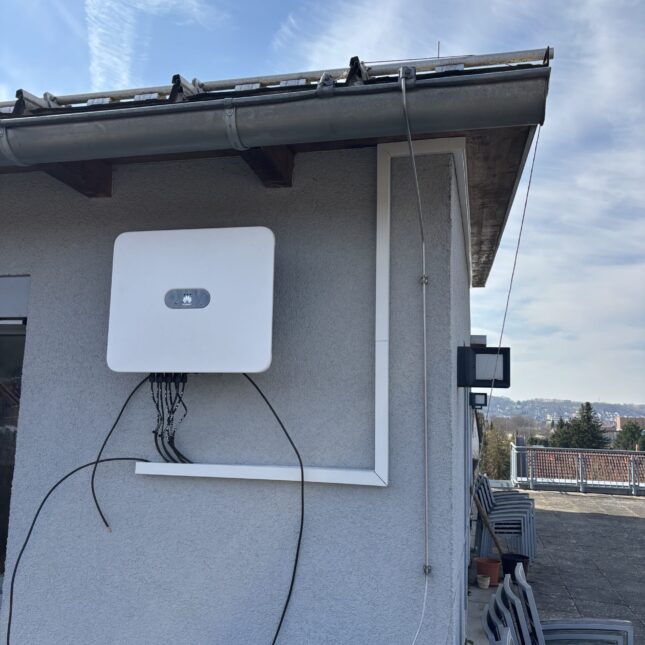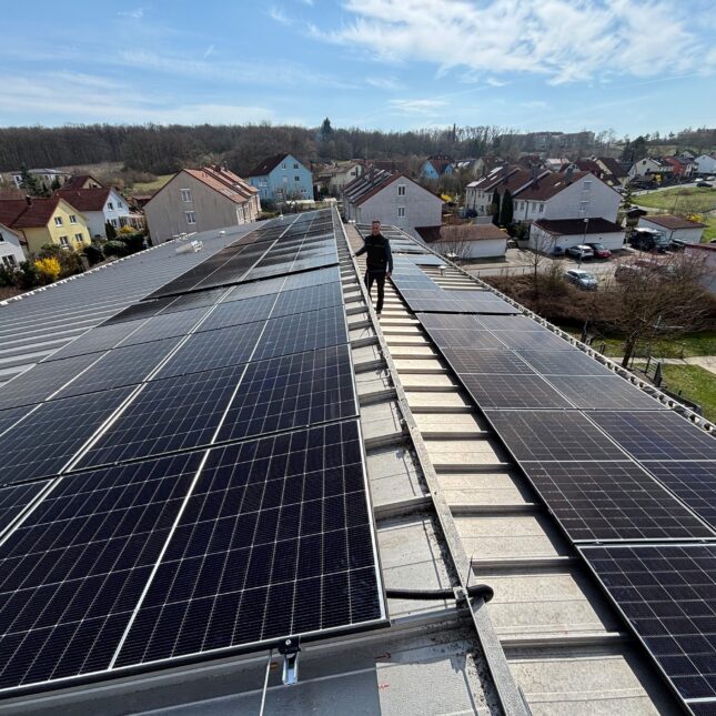 PV-Anlage mit einer Installationsgröße von 29,44 kWp, bestehend aus 64 PV-Modulen, 1 Wechselrichter, einem 10 kWh-Speicher und Ladesäule für E-Fahrzeuge vor Ort.